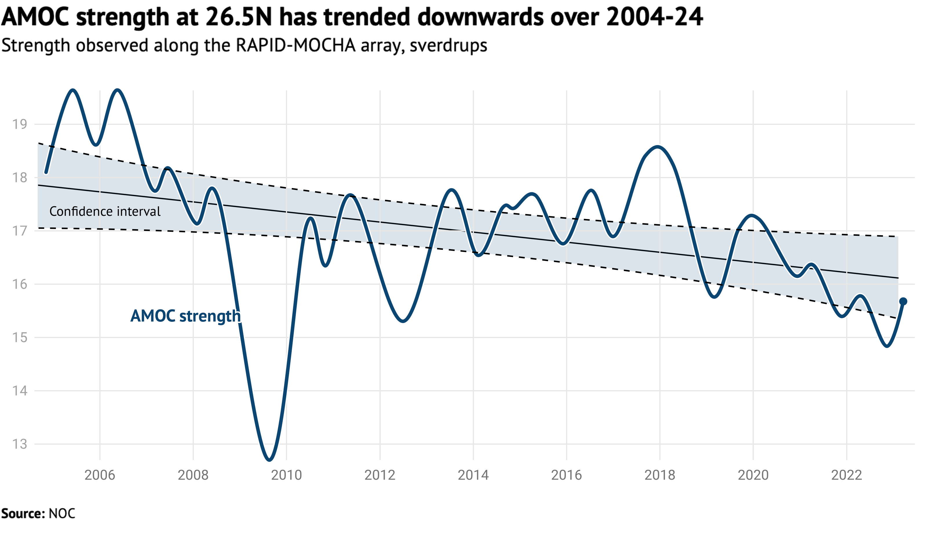 A 2023 review paper which analysed 20 years of RAPID measurements found that average AMOC strength annually was in the range of 15-17Sv between 2011 and 2020, down from 18-19Sv over 2004-08.