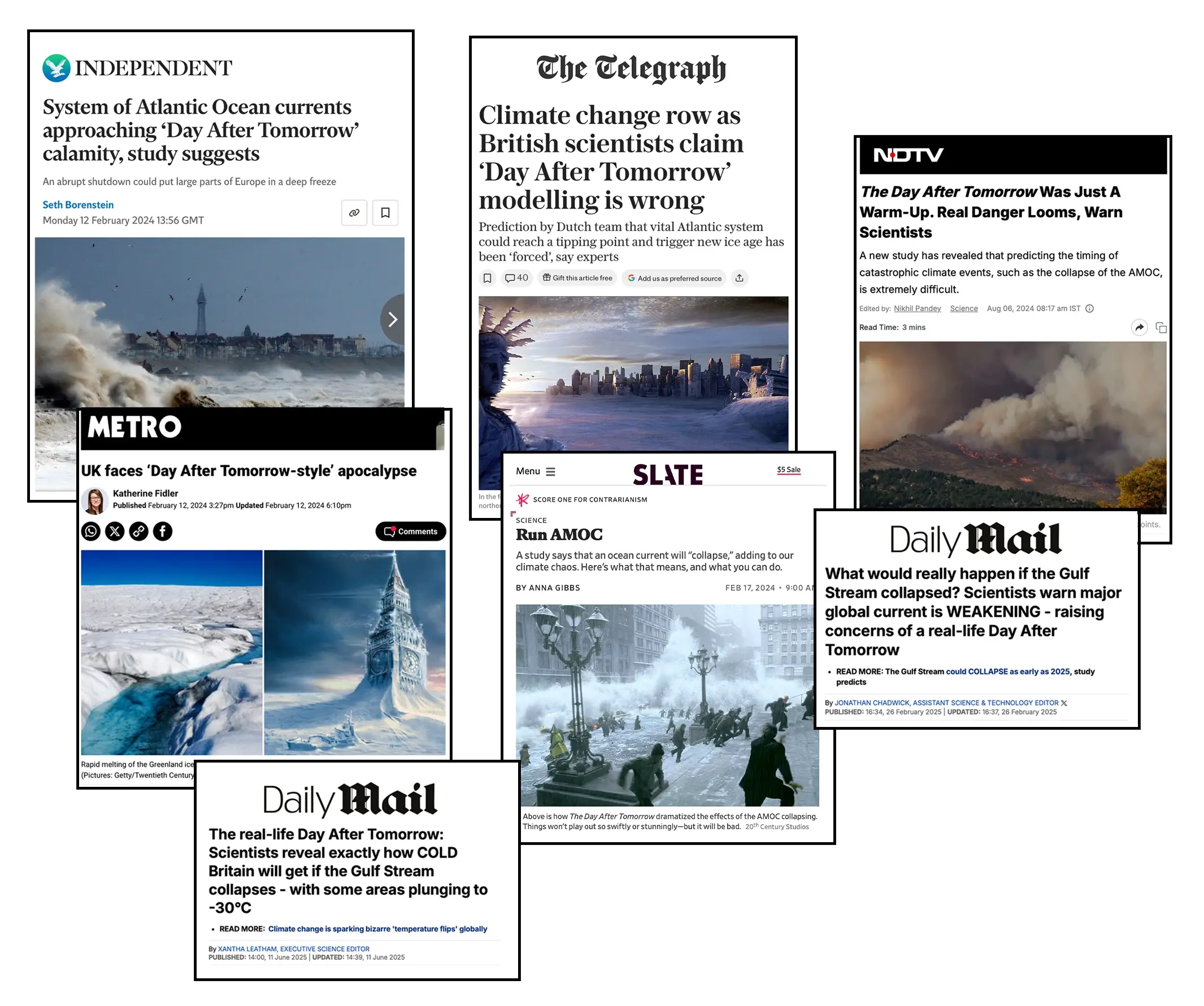 Coverage of AMOC science is often sensationalist in tone, with journalists frequently evoking catastrophic scenarios depicted in the 2004 blockbuster film The Day After Tomorrow. The film depicts the rapid onset of a new ice age after melting sea ice prompts Atlantic circulation patterns to almost instantaneously collapse.