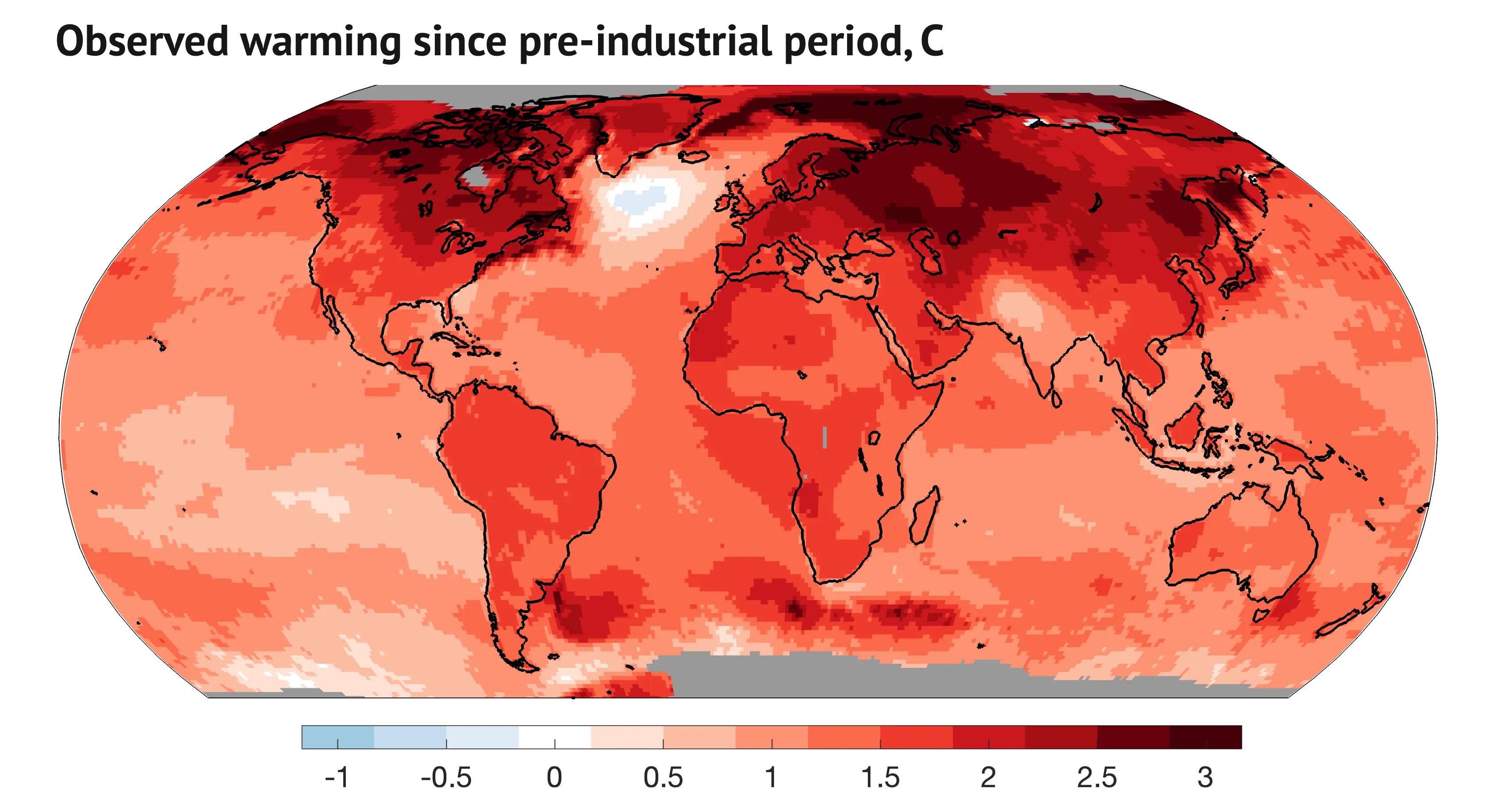This is shown by the map below, where red indicates places which have warmed since the pre-industrial period and blue shows places that have cooled.