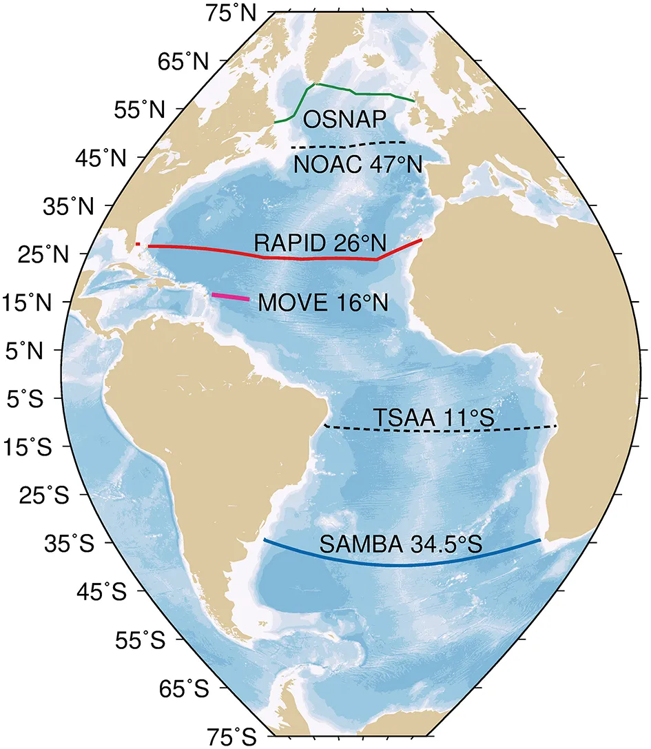 The map below shows the different trans-Atlantic mooring arrays that monitor the AMOC.