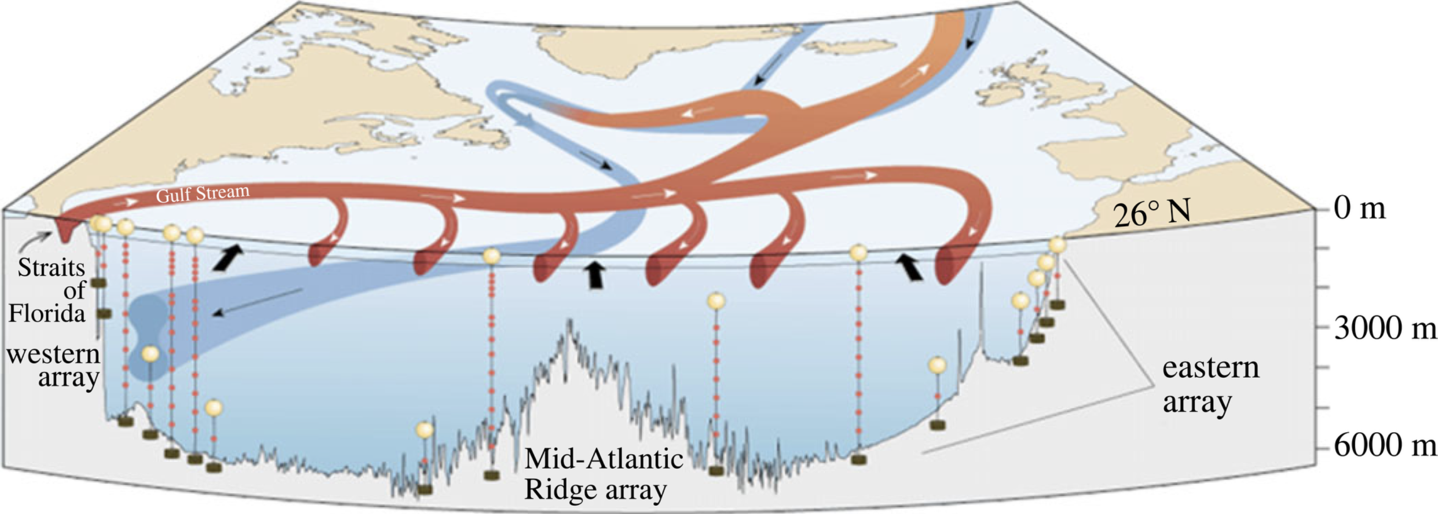 The oldest of these monitoring arrays is the RAPID observing system at a latitude of 26.5 degrees north. The array has collected continuous measurements in the mid-Atlantic and at its eastern and western boundaries – near the Bahamas and the Canary Islands – since 2004.