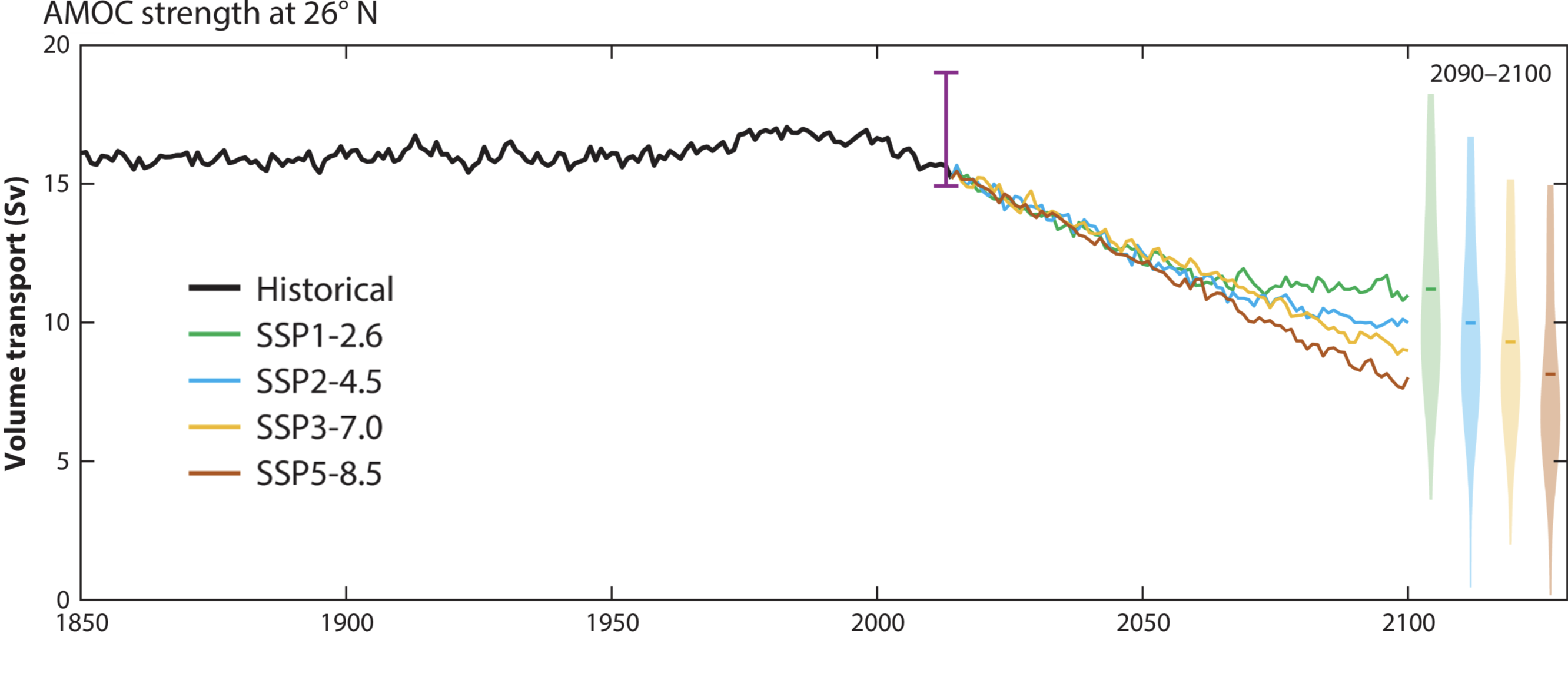 In AR6, the IPCC said the AMOC will “very likely decline” over the 21st century across all shared socioeconomic pathway (SSP) scenarios.