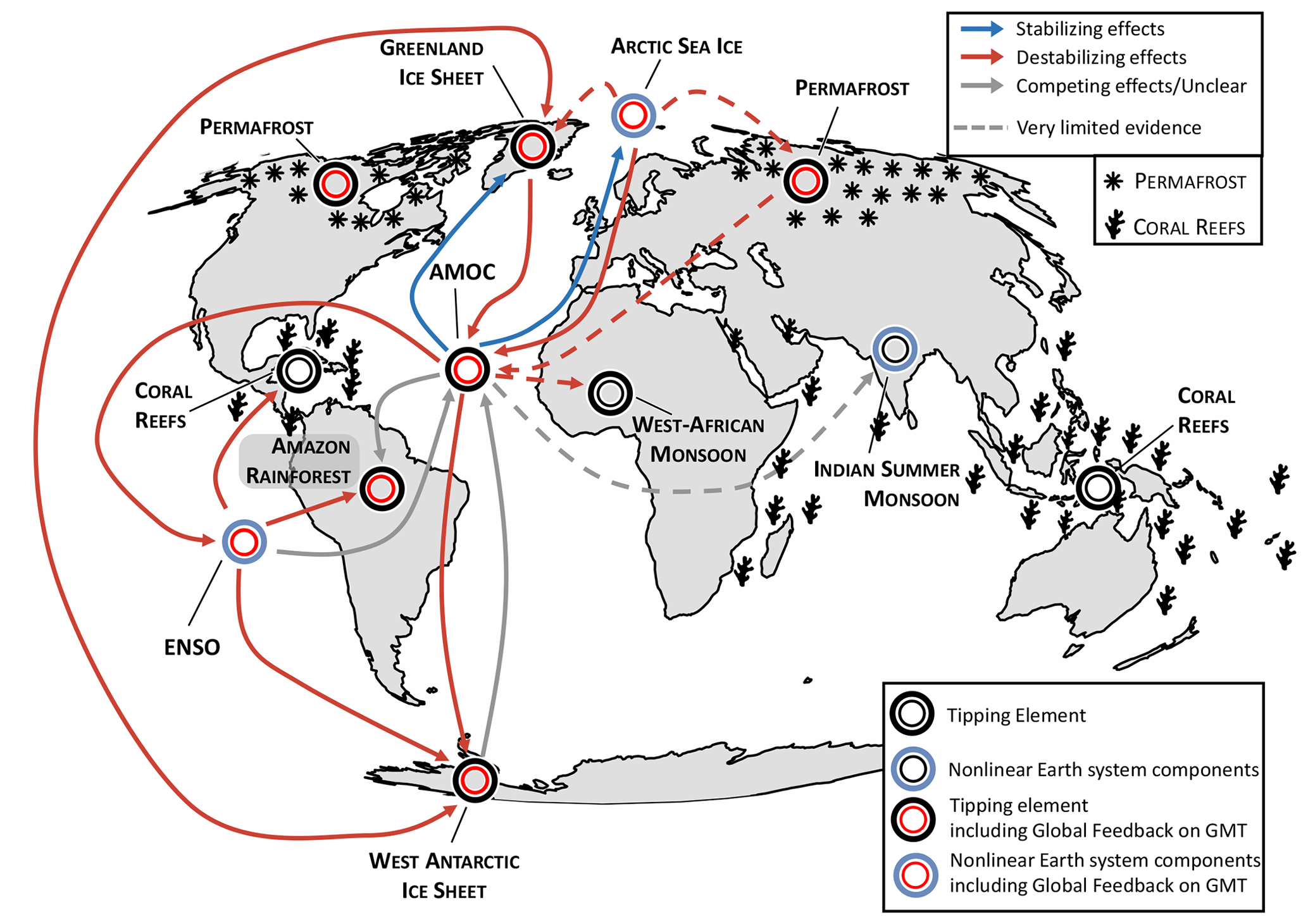 The map below shows how the collapse of the AMOC could end up destabilising a number of the Earth’s tipping elements, including the West Antarctic ice sheet and the Amazon rainforest. The red arrows illustrate destabilising effects between different tipping elements.